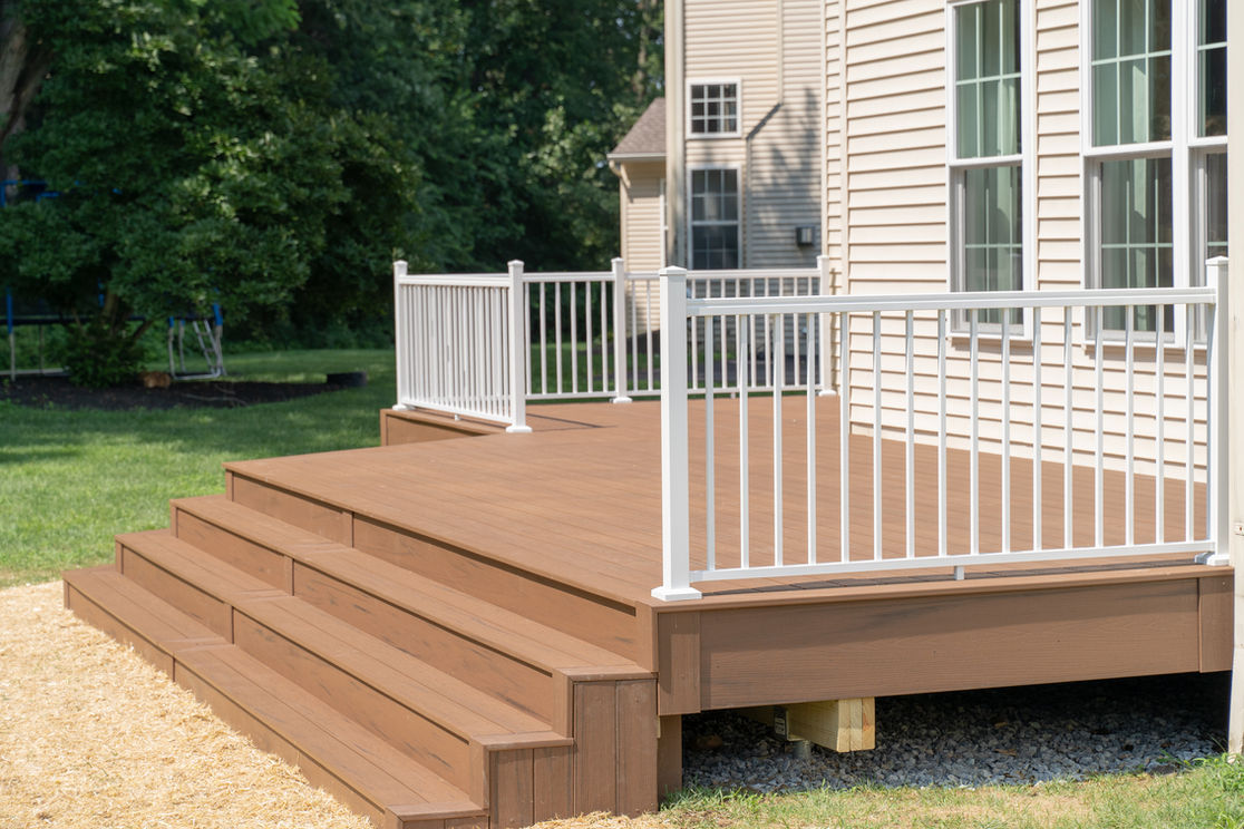 This newly completed deck project showcases the rich, earthy tones of Deckorators Voyage decking in Sedona, creating a warm and inviting outdoor space. The black aluminum railing provides a sleek contrast, while the black lattice skirting adds texture and depth. Two sets of stairs ensure seamless flow and accessibility, making this deck a perfect extension of the home for both relaxation and entertaining.
